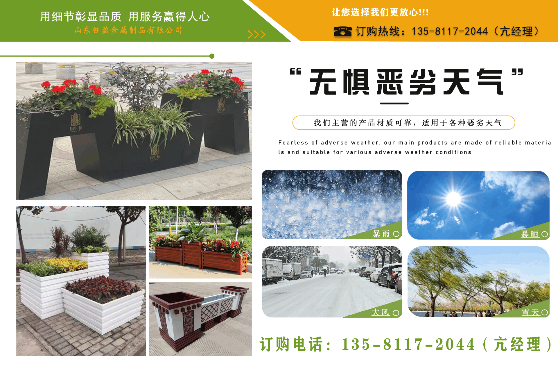 山東鈺盈金屬制品有限公司主營鍍鋅板花箱,道路隔斷花箱,定制花箱,戶外道路花箱,花箱座椅等產(chǎn)品,產(chǎn)品結(jié)構(gòu)合理、性能優(yōu)良,具有強度高、耐腐蝕、抗老化、隔熱隔音、節(jié)約能源、外形美觀、使用壽命長等優(yōu)點,深受國內(nèi)外客戶認可。 我們根據(jù)客戶所在城市的文化特征,制造出符合當?shù)爻鞘形幕瘹庀⒌淖匀涣Ⅲw、觀賞性強的花箱產(chǎn)品成為城市里一道靚麗的風景線。 公司實行誠實、公正、守信、價格合理、平等互利。 公司憑借雄厚經(jīng)驗實力,恪守誠信為本的原則,得到了眾多客戶的信賴,并在業(yè)界獲得良好的口碑。建立了穩(wěn)固的合作關(guān)系,隨著業(yè)務(wù)的不斷發(fā)展和壯大,合作伙伴的范圍也在不斷擴大。我們熱情盼望與您的合作,為社會的可持續(xù)發(fā)展獻上一份努力。...